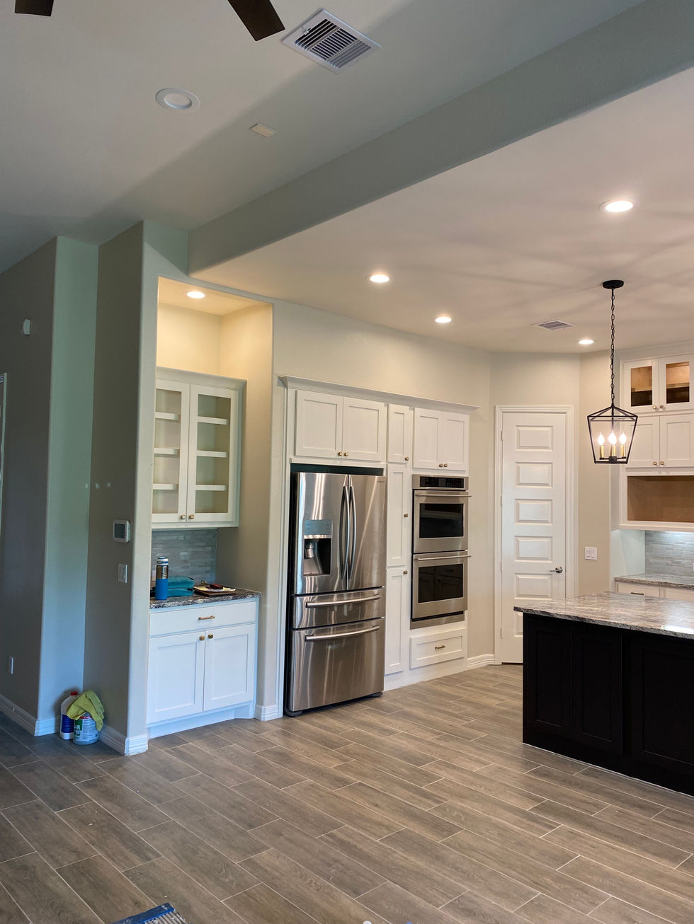 A collection of modern kitchen remodel projects featuring white cabinets, marble countertops, stainless steel appliances, and elegant lighting.